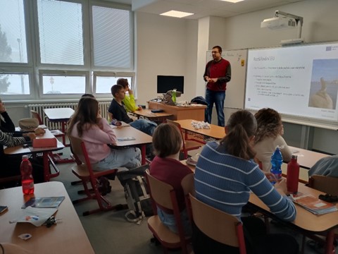 Dlouhodobá spolupráce s Europe Direct a panem Janem Kabrdou, vzděláním regionálním geografem, přinesla další ovoce v podobě prosincové přednášky a besedy se studenty kvinty. Zopakovali a doplnili si svoje dosavadní znalosti o okolnostech vstupu naší republiky do EU a například zjistili, jaké projekty EU ve Žďáru podpořila a podporuje - park Farská humna, cyklostezky, Zelená hora a mnoho dalších. Přednášku doplnily dotazy, které pan Kabrda ochotně zodpověděl. Někteří studenti a studentky projevili značné znalosti a zájem o EU. Na závěr pan Kabrda rozdal kvintánům informační materiály i sladké odměny.