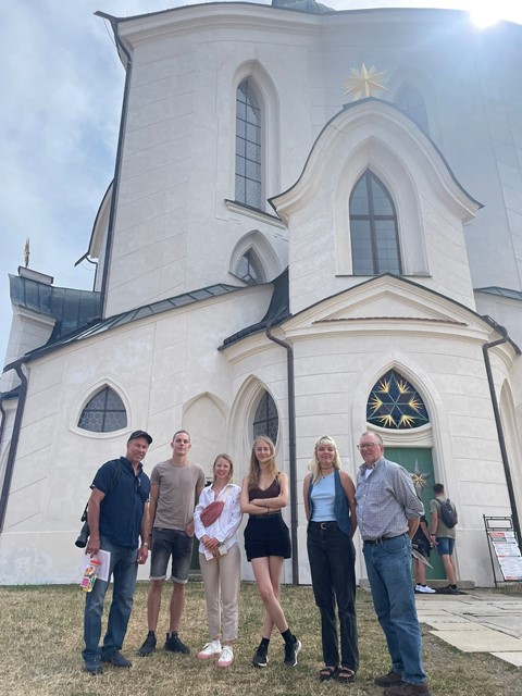 Bylo nám tedy velkou ctí, že nás během prázdnin dva členové Sokola – Dave a John navštívili, a mohli si tak prohlédnou naši školu a město. Nemohli jsme samozřejmě vynechat Poutní kostel sv. Jana Nepomuckého na Zelené hoře, kde nám Viktorie udělala skvělou prohlídku. Studenti si pak s Davem dokonce zahráli frisbee. Bylo to velmi milé setkání.