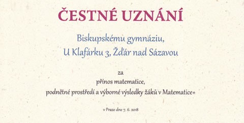 Dlouhodobě výborné výsledků naších studentů ve volitelné části státní maturitní zkoušky Matematika+ ocenil v loňském školním roce výbor pro vzdělávání, vědu, kulturu, lidská práva a petice při senátu České republiky. Zástupce naší školy Mgr. Josef Kratochvíl převzal z rukou místopředsedy výboru Jiřího Růžičky čestné uznání za "přínos matematice, podnětné prostředí a výborné výsledky žáků v Matematice+". Ocenění nás obzvláště těší už proto, že jej obdrželi zástupci pouhých devíti nejlepších gymnázií z České republiky.