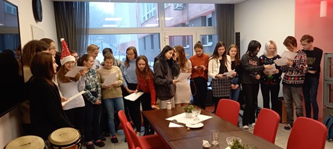 Předvánoční atmosféru v jídelně naší školy doplnily koledy a vánoční písně zpívané v cizích jazycích a za doprovodu hudebních nástrojů. Letos jsme s oktávou, 1.B a 2.B připravili ruskou verzi známé písně Rolničky, rolničky a také jsme zazpívali ukrajinskou koledu Дзень - дзелень, jejíž melodie se nám velmi líbila a text studenti také zvládli na jedničku.