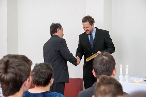 Po proslovech hostů o významu ekologické certifikace pro školu, pro společnost i pro přírodu převzal pan ředitel Ing. Jiří Cočev z rukou pana Radka Černého dřevěnou tabulku s udělením certifikace.