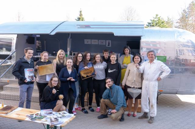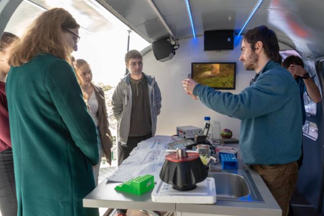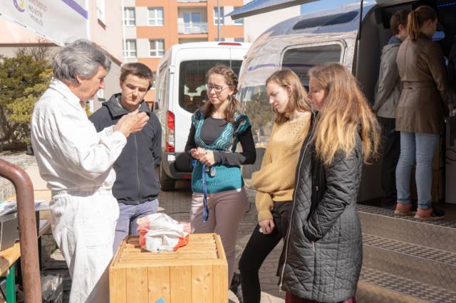 Přijela nová pojízdná laboratoř s pěti odborníky na biologii, kteří na svých stanovištích ukázali studentům nejnovější trendy z oborů botaniky, včelařství a molekulární biologie.