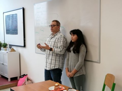 Tatínek naší studentky pan Joshua William Hatton Waldrep, rodilý Američan žijící v našem městě již několik let, se se studenty sekundy a tercie přišel podělit o svoji zkušenost s tímto nám neznámým svátkem. Tradice Dne díkuvzdání spadá do roku 1620, kdy skupina tzv. Pilgrim Fathers odplula z Anglie na lodi Mayflower, aby unikla téměř jisté smrti kvůli jiné náboženské orientaci. Když 102 lidí zakotvilo na počátku prosince blízko Bostonu, čekala je krutá zima a polovina z nových osadníků zemřela. Těm 50 pak pomohli Indiáni postavit domy, pěstovat kukuřici a lovit zvěř. Další rok mohli osadníci a Indiáni společně oslavit první úspěšnou sklizeň. Až Abraham Lincoln v roce 1863 uzákonil tento den jako státní svátek.